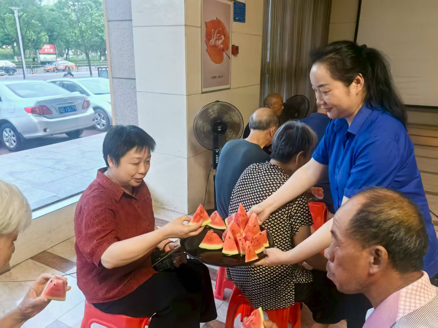 活動(dòng)尚未開始,入口處已是一派熱鬧景象。物業(yè)工作人員早早備好冰鎮(zhèn)綠豆湯、清甜西瓜與礦泉水,為陸續(xù)到場(chǎng)的居民遞上夏日清涼。趁居民就座間隙,工作人員結(jié)合案例,生動(dòng)講解消防隱患排查、電信詐騙防范等實(shí)用知識(shí),“手把手”教大家識(shí)別騙局、掌握逃生技巧,在輕松互動(dòng)中筑牢社區(qū)安全防線。