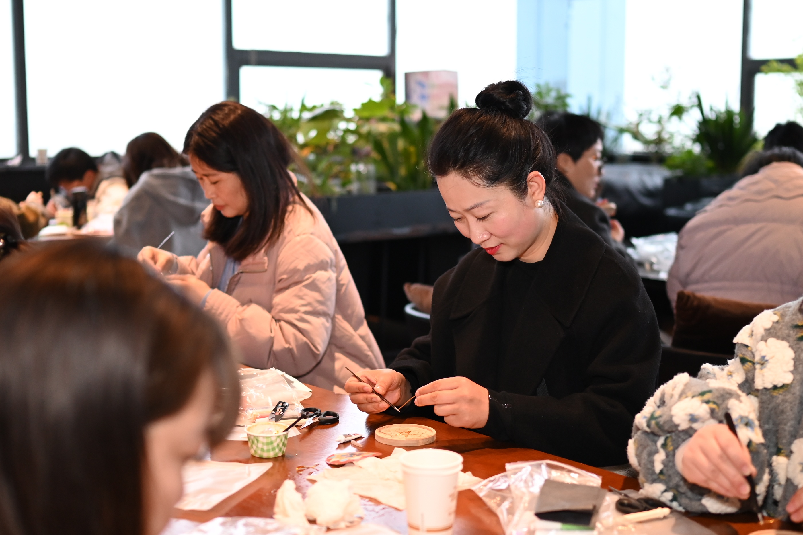 活動(dòng)伊始,兩位指導(dǎo)老師分別講解掐絲琺瑯的技法和串珠包的編織技巧。隨后,女員工們們迅速投入創(chuàng)作——掐絲琺瑯工藝區(qū),大家用鑷子將金絲彎折成型,在盤(pán)底勾勒出蓮花、游魚(yú)或水波紋,再用鏟刀將彩砂層層點(diǎn)染,金絲與釉料交相輝映,一幅幅作品逐漸呈現(xiàn)。一旁的串珠包制作區(qū)同樣熱鬧非凡,晶瑩珠串在指尖流轉(zhuǎn)穿梭,穿針引線、配色綰結(jié),巧思于方寸間緩緩鋪展,一只只精巧別致的串珠包悄然成型。