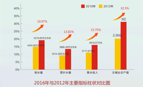 2016年制水量達(dá)5219.83萬立方米,較2012年制水量4424.56萬立方米增長19.97%;營抄水量3886.28萬立方米,同比3414.38萬立方米增長13.82%;售水收入6618.57萬元,同比5717.87萬元增長15.75%;2016年公司主輔業(yè)總產(chǎn)值創(chuàng)歷史新高,首次突破3億元,同比2.26億元增長32.5%。